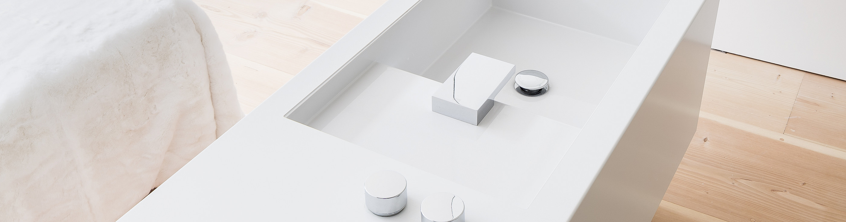 Bespoke Aluminium shell and Alape plus Dornbracht pieces put together with a drawer on the side. Designed for open space and mirror on side.